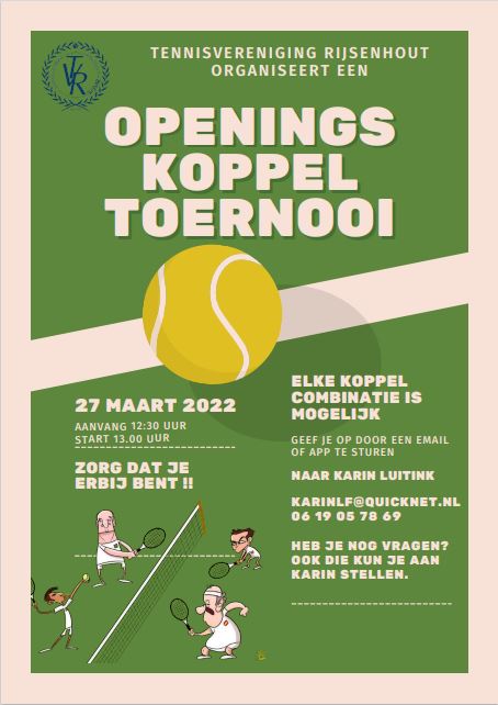 Dit gebeurt op zondag 27 maart in de middag. Elke combinatie kan zich inschrijven. Dus man-vrouw, man-man, vrouw-vrouw, kortom, iedereen met wie je het leuk vindt om te tennissen.