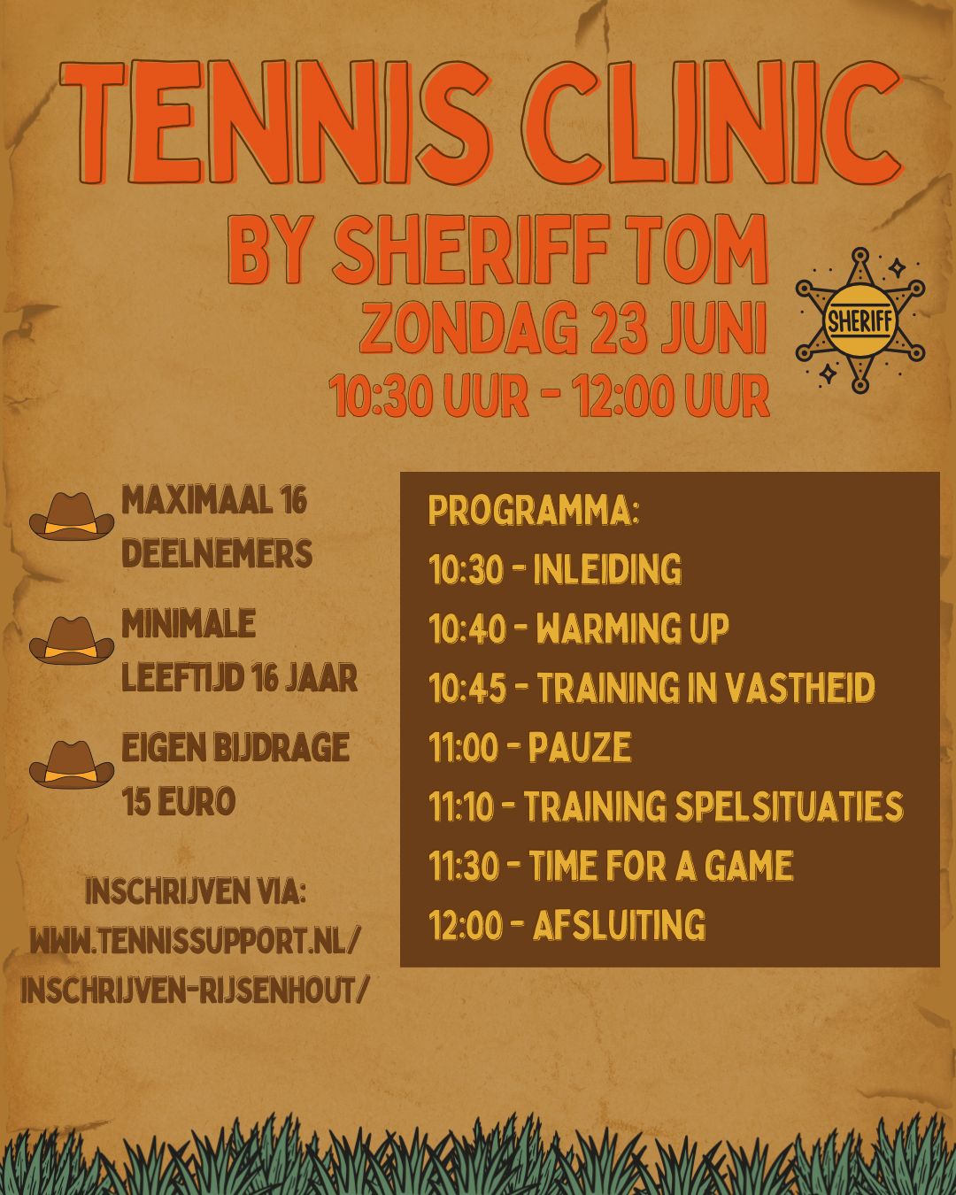 Er is een clinic voor zowel de tennis- als de padelliefhebbers! De tennisclinic vindt plaats op zondagochtend van 10:30 tot 12:00 uur en wordt gegeven door ‘Sheriff Tom’.