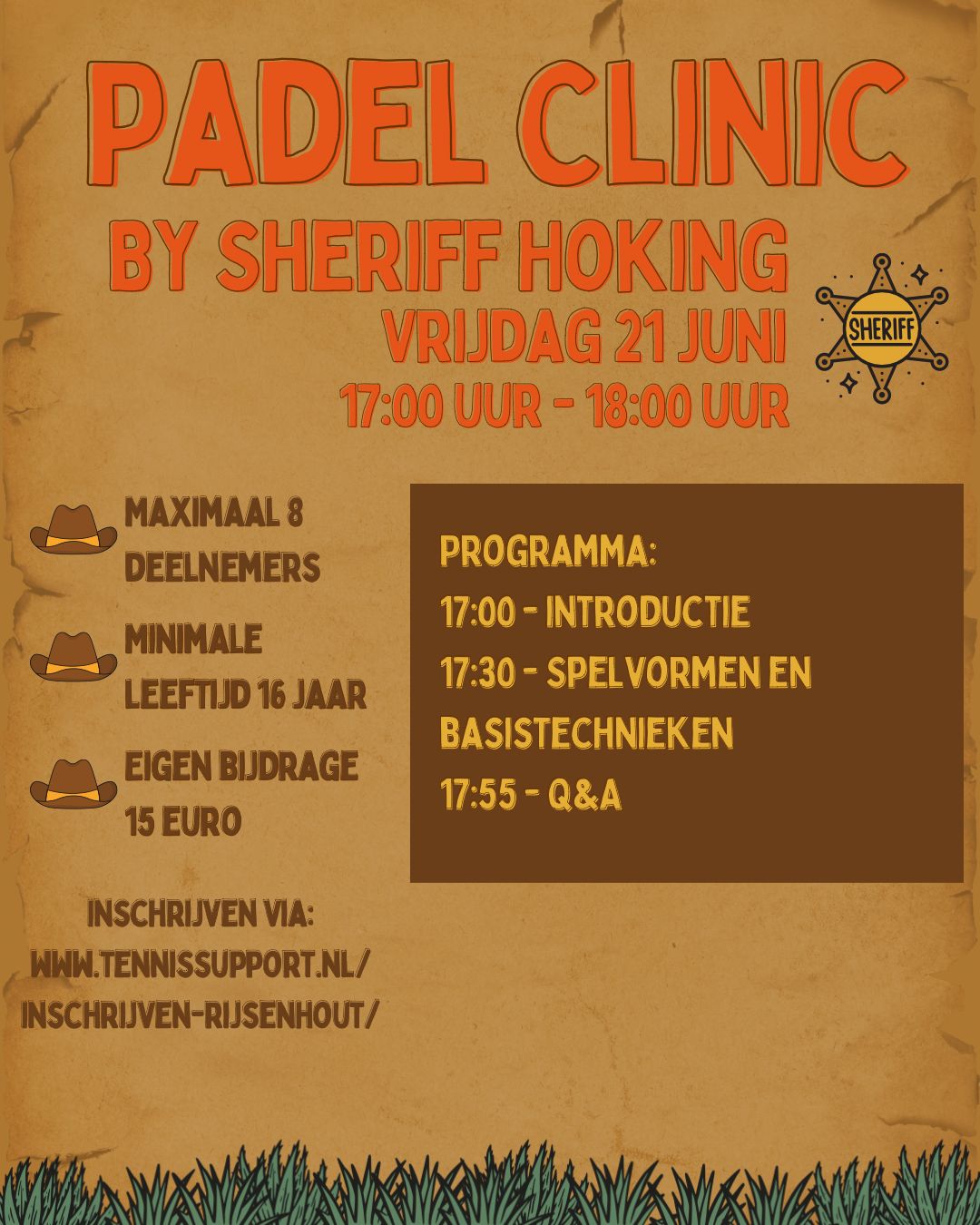 Voor de padelclinic moet je vrijdagavond van 17:00 tot 18:00 uur in je agenda zetten 🕰 Hier worden goede tips en tricks gegeven door ‘Sheriff Hoking’.